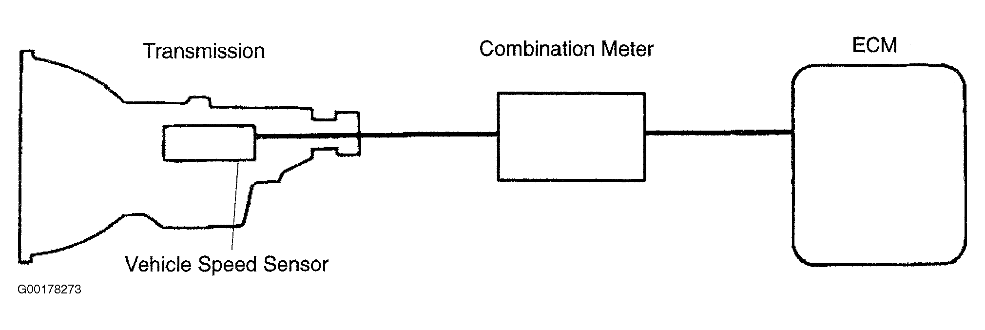The vehicle speed sensor detects the rotation speed of the transmission output shaft and sends signals to the ECM. See Fig 1. The ECM determines the vehicle speed based on these signals. An AC voltage is generated in the vehicle speed sensor coil as the rotor mounted on the output shaft rotates and this voltage is sent to the ECM.