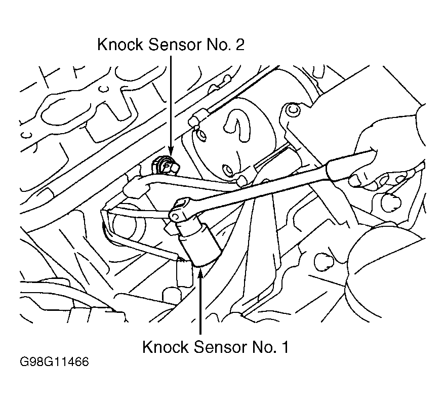 - Check for open and short in wiring harness and electrical connectors between EC1 electrical connector and knock sensor No. 2. See WIRING DIAGRAMS article. Knock sensor No. 2 is located below intake manifold on cylinder block. See Figure. If wiring harness or electrical connector is defective, repair as necessary. If wiring harness and electrical connectors are okay, replace knock sensor No. 2. See KNOCK SENSOR under ENGINE SENSORS & SWITCHES in REMOVAL, OVERHAUL & INSTALLATION - V6 & V8 article.