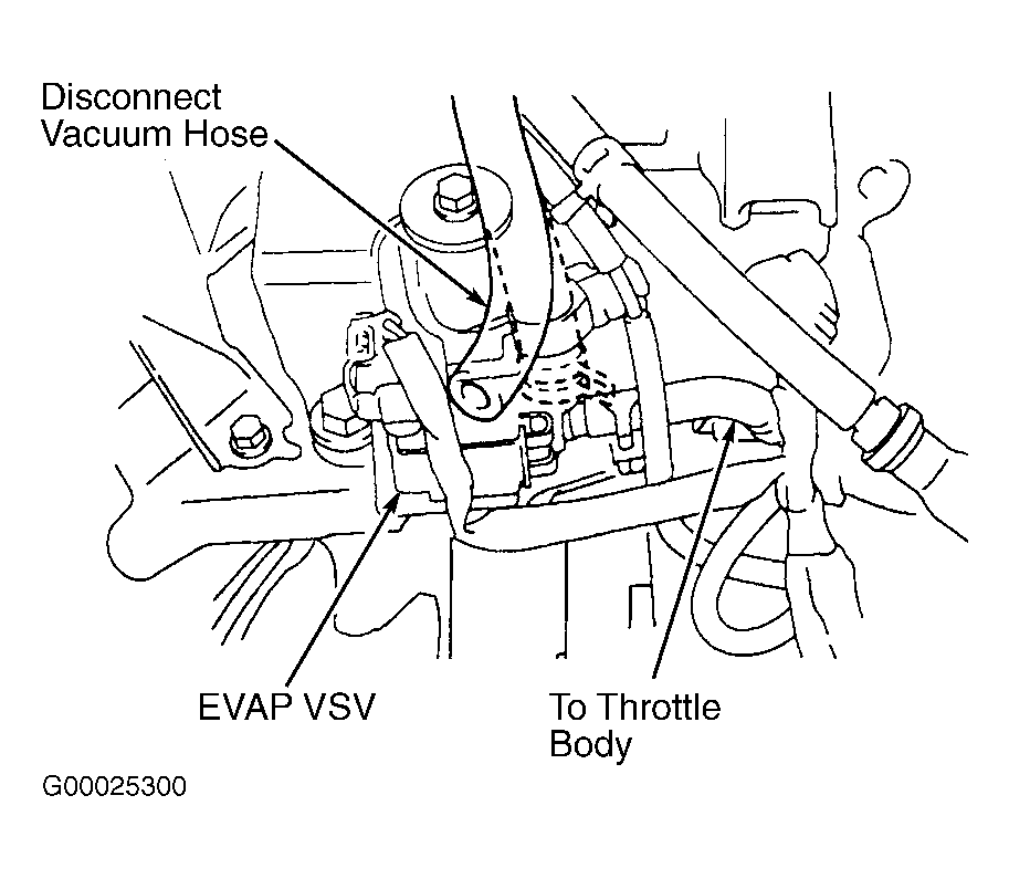 - Check for damaged, disconnected or restricted vacuum hose between throttle body and EVAP VSV. If vacuum hose is okay, go to next step. If vacuum hose is damaged, disconnected or restricted, repair or replace vacuum hose as necessary.