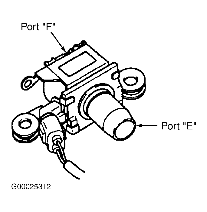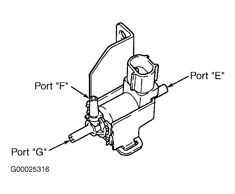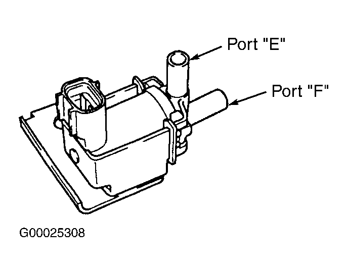 - To test EVAP VSV operation, apply air pressure to port "E" on EVAP VSV. See Fig 2. Ensure air does not flow from port "F". Apply battery voltage and ground to electrical terminals on EVAP VSV. Apply air pressure to port "E" on EVAP VSV. Ensure air flows from port "F". If EVAP VSV operates as specified, go to next step. If EVAP VSV does not operate as specified, replace EVAP VSV along with charcoal canister. Clean vacuum hoses between throttle body and EVAP VSV, and between EVAP VSV and charcoal canister.