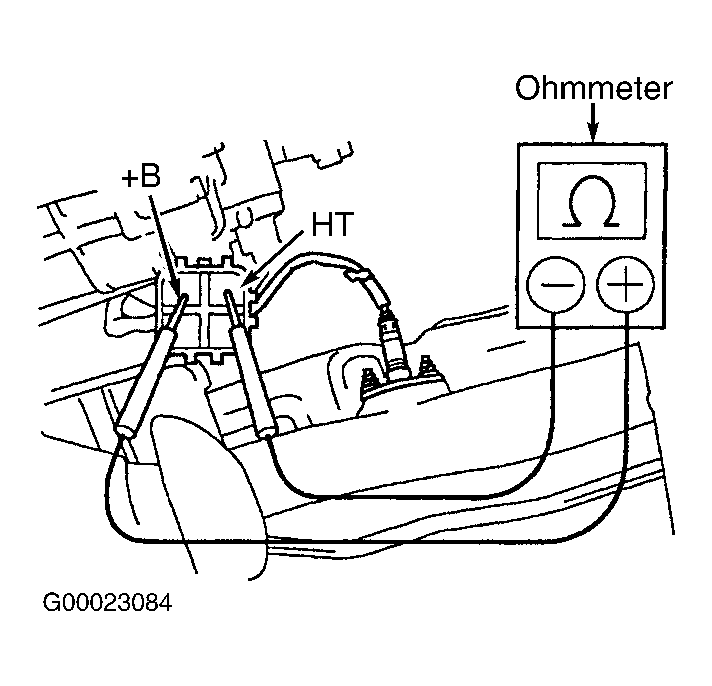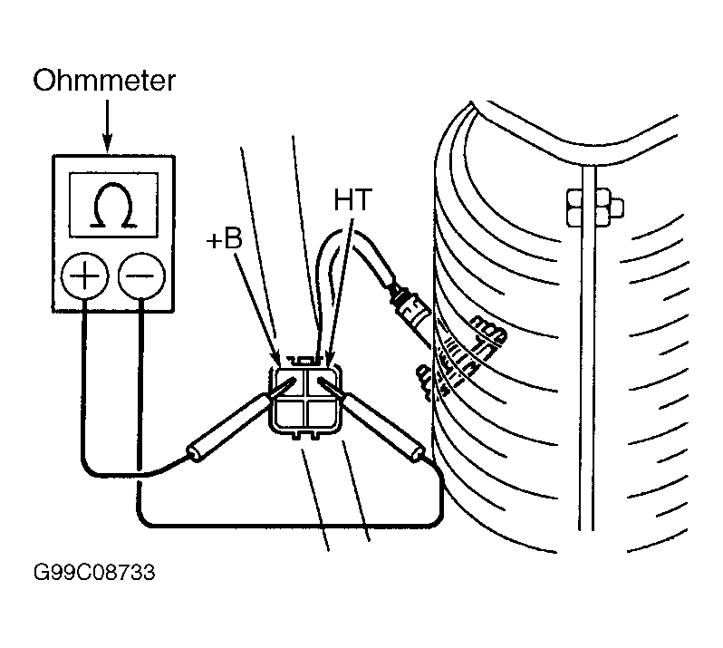 - Disconnect electrical connector for heated oxygen sensor. Heated oxygen sensor is located on exhaust pipe, behind catalytic converter. Using ohmmeter, check resistance between +B and HT terminals on electrical connector for heater on heated oxygen sensor. See Fig 2. Resistance should be 11-16 ohms at 68°F (20°C) and 23-32 ohms at 1472°F (800°C). If resistance is within specification, replace catalytic converter. If resistance is not within specification, replace heated oxygen sensor. See HEATED OXYGEN SENSOR under ENGINE SENSORS & SWITCHES in REMOVAL, OVERHAUL & INSTALLATION - V6 & V8 article