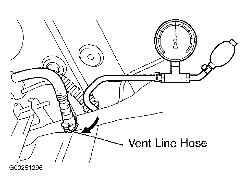 Disconnect vent line hose from fuel tank and pressurize fuel tank to .58 psi (4 kPa). See Fig 1. Check that internal pressure of fuel tank holds for one minute. If pressure does not hold, check connected portions of each hose and pipe. Check installed parts on fuel tank including cap and/or gasket. If connections and parts are normal, replace fuel tank and filler pipe. Reconnect EVAP vent line hose to fuel tank.
