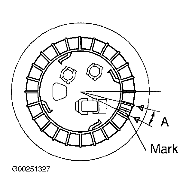 - Using special tool (09808-14020), tighten retainer one more complete turns and position mark on retainer into range "A" of fuel tank. Turn retainer two complete turns and position mark. See Fig 4. A rib on retainer can be fitted into a tip of special tool.