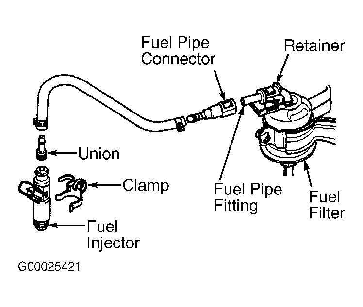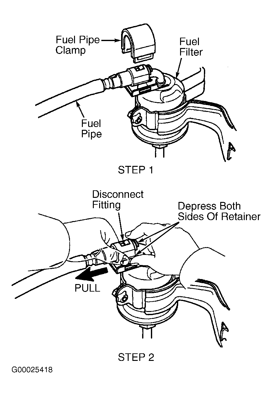 - Depress both sides of retainer and pull fuel pipe with disconnect fitting from fuel filter. Perform STEP 2 in illustration. See Fig 1. Use care when disconnecting fuel pipe from fuel filter, as some residual fuel pressure may still exist in the fuel system.