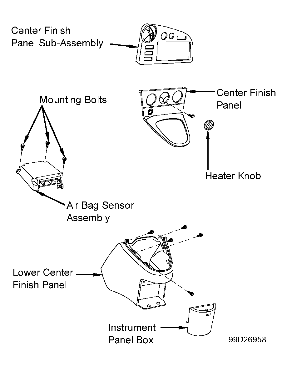 - Remove instrument panel center finish panel sub-assembly. See Fig 1. Remove heater control knob. Remove instrument panel center finish panel. Remove instrument panel box. Remove instrument panel lower center finish panel. Disconnect air bag sensor assembly electrical connectors. Remove mounting bolts and air bag sensor assembly.