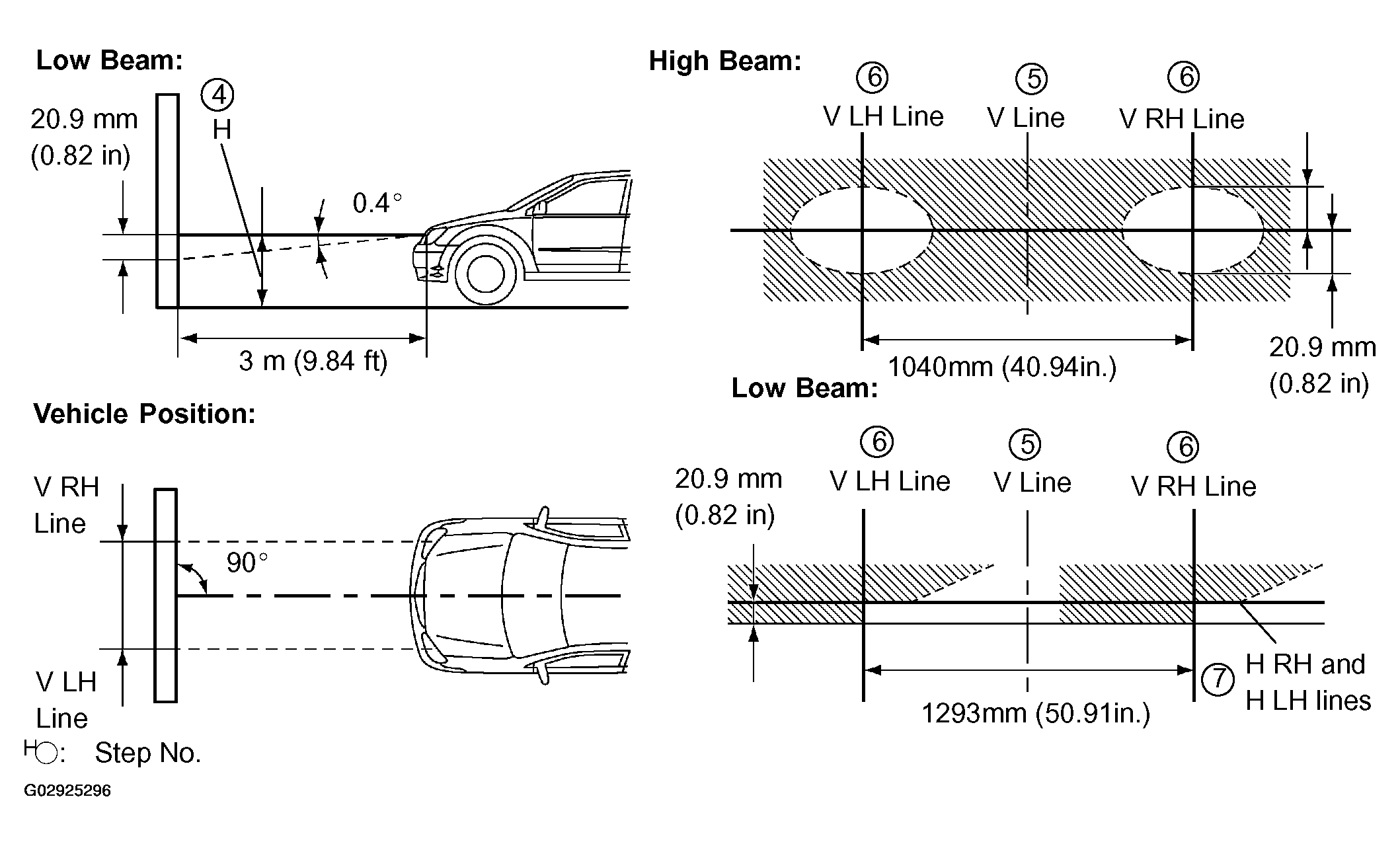 The H RH and H LH line is 0.4° below the horizontal line (H line) of the light axis.