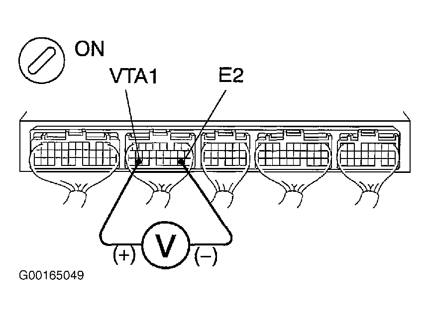 - Connect TP sensor harness connector. Access ECM harness connectors behind glove box. Turn ignition on. Backprobing ECM harness connector, measure voltage between terminals No. 23 (Blue/White wire) and No. 18 (Brown wire) at ECM E8 connector. See Figure and Fig 2 . Voltage should be .3-1.0 volt with throttle fully closed, and 2.7-5.2 volts with throttle fully open (WOT). If voltages are as specified, replace ECM and retest system. If voltages are not as specified, locate and repair open or short in Blue/White wire between TP sensor and ECM E8 connector.