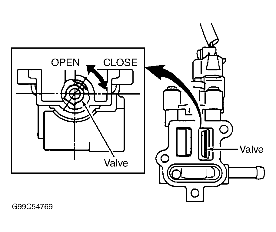 6. Turn ignition on. Check that valve on inside of IAC valve moves. Repeatedly disconnect and reconnect electrical connector for IAC valve several times while checking that valve on inside of IAC valve opens and closes. See Fig 1.