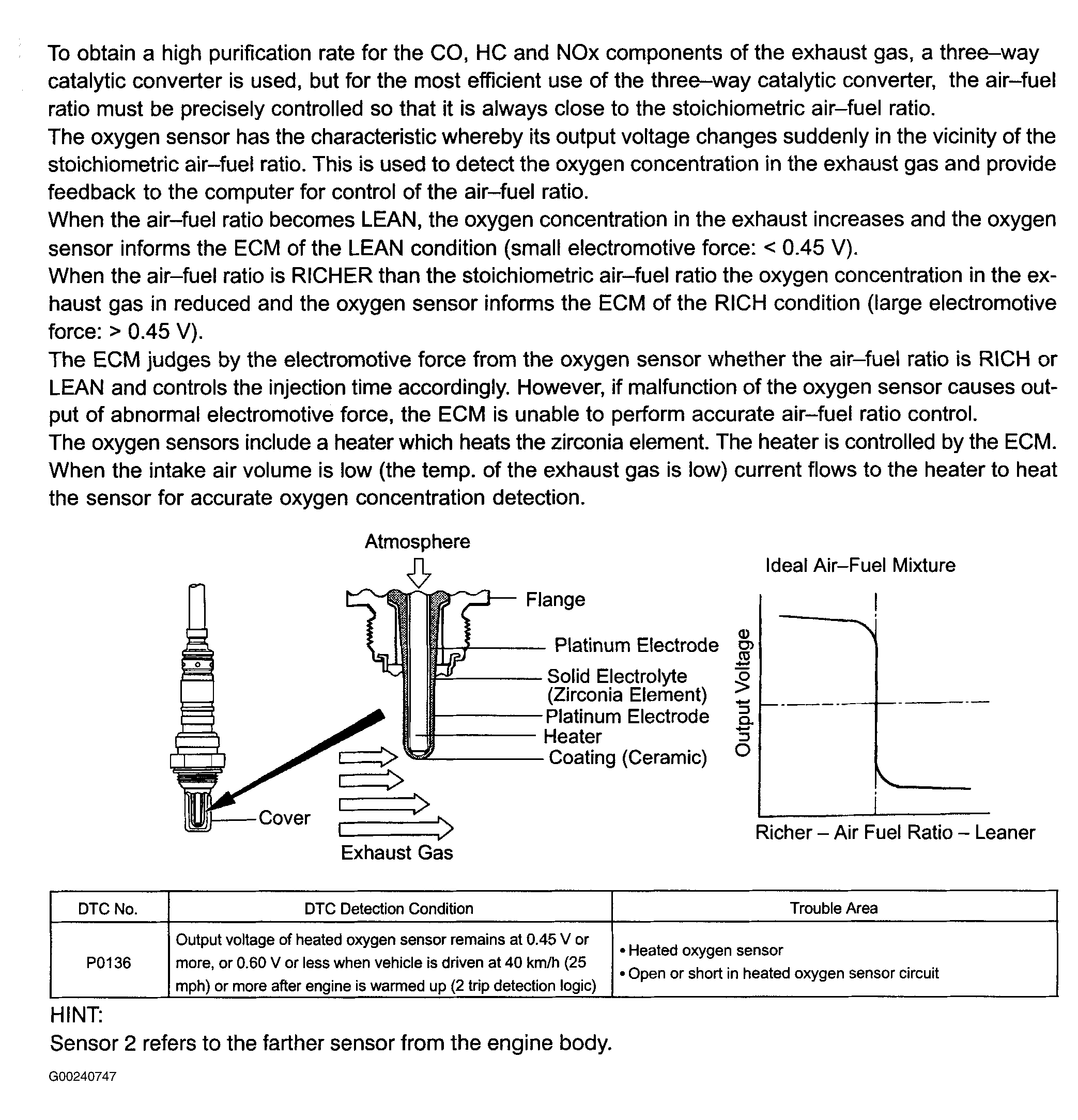 Home >> Toyota >> 2003 >> Matrix Base, FWD, Standard >> Repair and Diagnosis >> External Pages >> Different car >> Section 101 (Engine Control System Self Diagnostics - 4-Cylinder) >> Diagnostic Tests >> DTC P0136: Oxygen Sensor Circuit Malfunction (Bank No. 1 Sensor No. 2) >> Circuit Description & Possible Causes