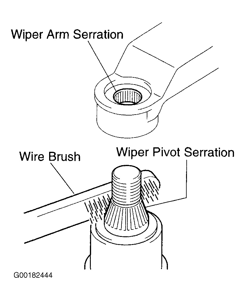 3. Install the RH front wiper arm. Operate the wiper and stop the windshield wiper motor assembly at the automatic stop position. Scrape off the serration part of the wiper arm with a round file or equivalent. See Fig 1. Clean the wiper pivot serration with the wire brush. Align the front wiper blade front end with the mark and install the RH front wiper arm with the nut. See Fig 2. Tighten the nut to specified torque. See TORQUE SPECIFICATIONS .
