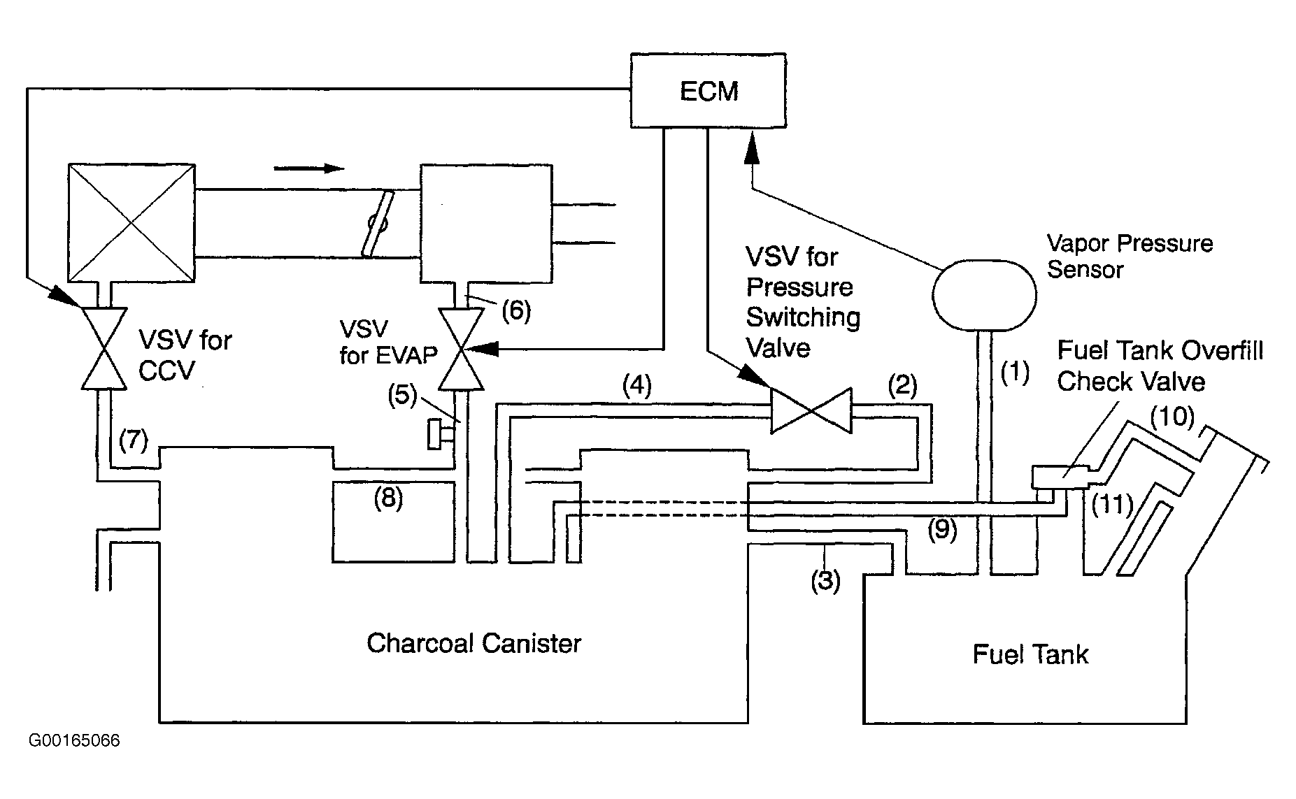 Vapor pressure sensor, canister closed valve Vacuum Switching Valve (VSV) and pressure switching valve VSV are used to detect faults in EVAP system. ECM determines if a fault is present in EVAP system based on vapor pressure signal circuit. See Fig 1.