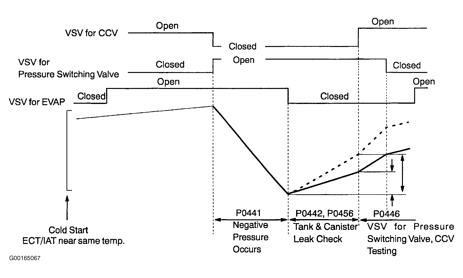 DTC P0441 is set when ECM closes the CCV and opens the VSV for pressure switching valve causing vacuum to increase in the entire EVAP system. The ECM continues to operate the VSV for EVAP until the vacuum is increased to a specified point at which time the ECM closes the VSV for EVAP. If the vacuum did not increase, or if the vacuum increased beyond the specified limit, the ECM judges the VSV for EVAP and related components to be faulty. DTC P0446 is set when vapor pressure rises to a specified point, the ECM opens the VSV for CCV. Pressure will increase rapidly because of the air allowed into the system. No increase or an increase below specified rate of pressure increase indicates a restriction on the air inlet side. The ECM closes the VSV for pressure switching valve. This action blocks air entering the fuel tank side of system. The pressure rise on the fuel tank side is no longer as great. If there was no change in pressure, the ECM will conclude the VSV for pressure switching valve did not close. See Fig 2. Possible causes are:
