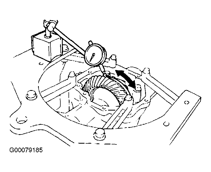 - Place a dial indicator on the teeth surface on the ring gear vertically, check with fixing the driven pinion and moving the ring gear. See Figure. Backlash should be .004-.006" (.10-.15 mm).