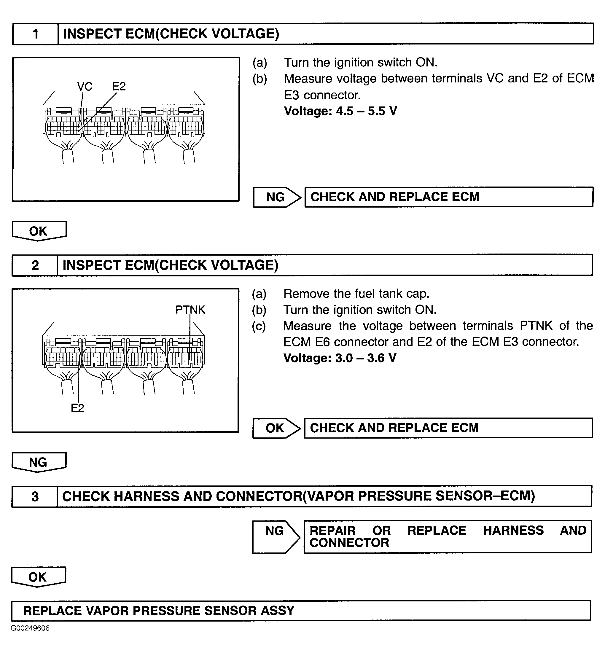 For testing of vapor pressure sensor, see Fig 1. Before replacing ECM, check ECM connectors and ground circuits. See ENGINE CONTROL MODULE POWER & GROUND CIRCUITS .