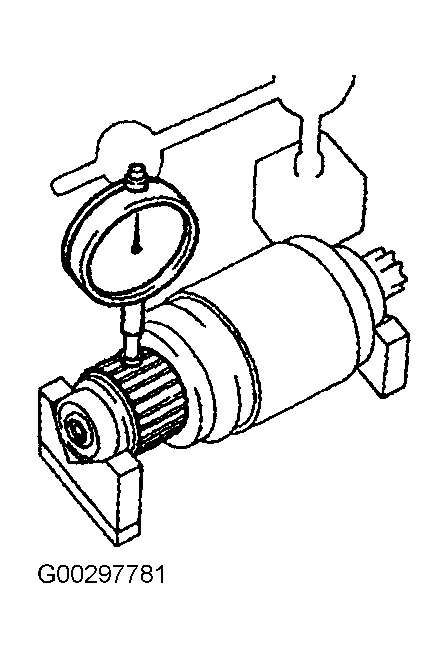 2. Place the commutator on V-blocks and use a dial indicator to measure runout (out-of-round). See Fig 1. If commutator runout is more than specification, turn commutator on a lathe and proceed to step  3. For specification, see STARTER SPECIFICATIONS .