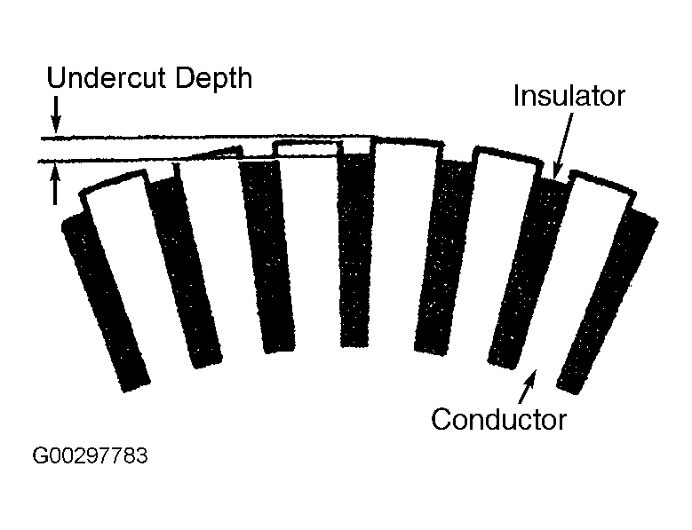 4. Ensure undercut depth between commutator segments are clean, free of debris, and that edges are smooth, and within specification, see Fig 3. If undercut depth is less than minimum, use a hacksaw blade to correct it. See STARTER SPECIFICATIONS .