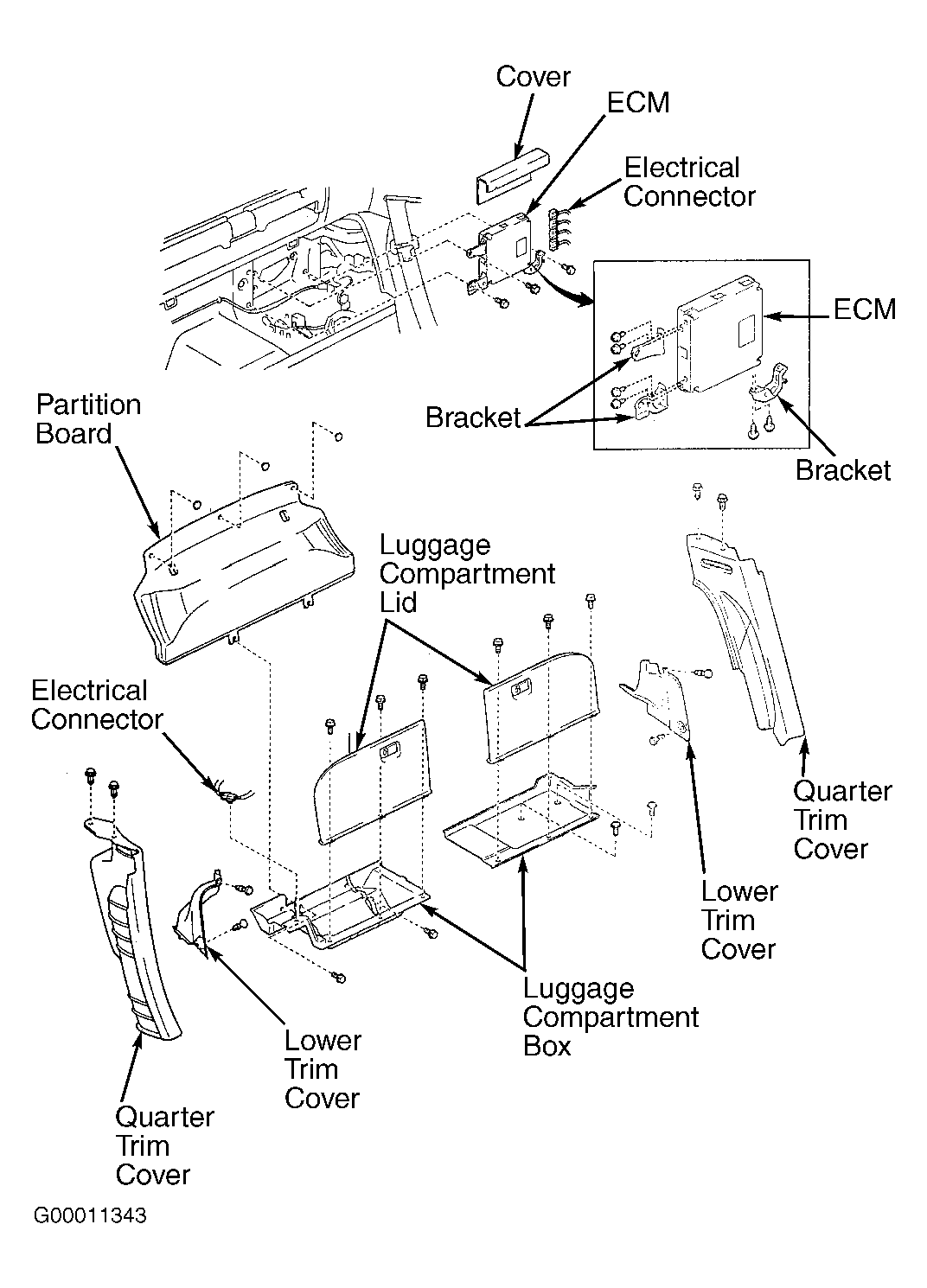 3. Remove luggage compartment lids, luggage compartments, quarter trim panels, lower trim covers, partition board and cover for access to ECM. See Fig 1. For additional information on removal of luggage compartment components, see FUEL PUMP  under FUEL SYSTEMS.