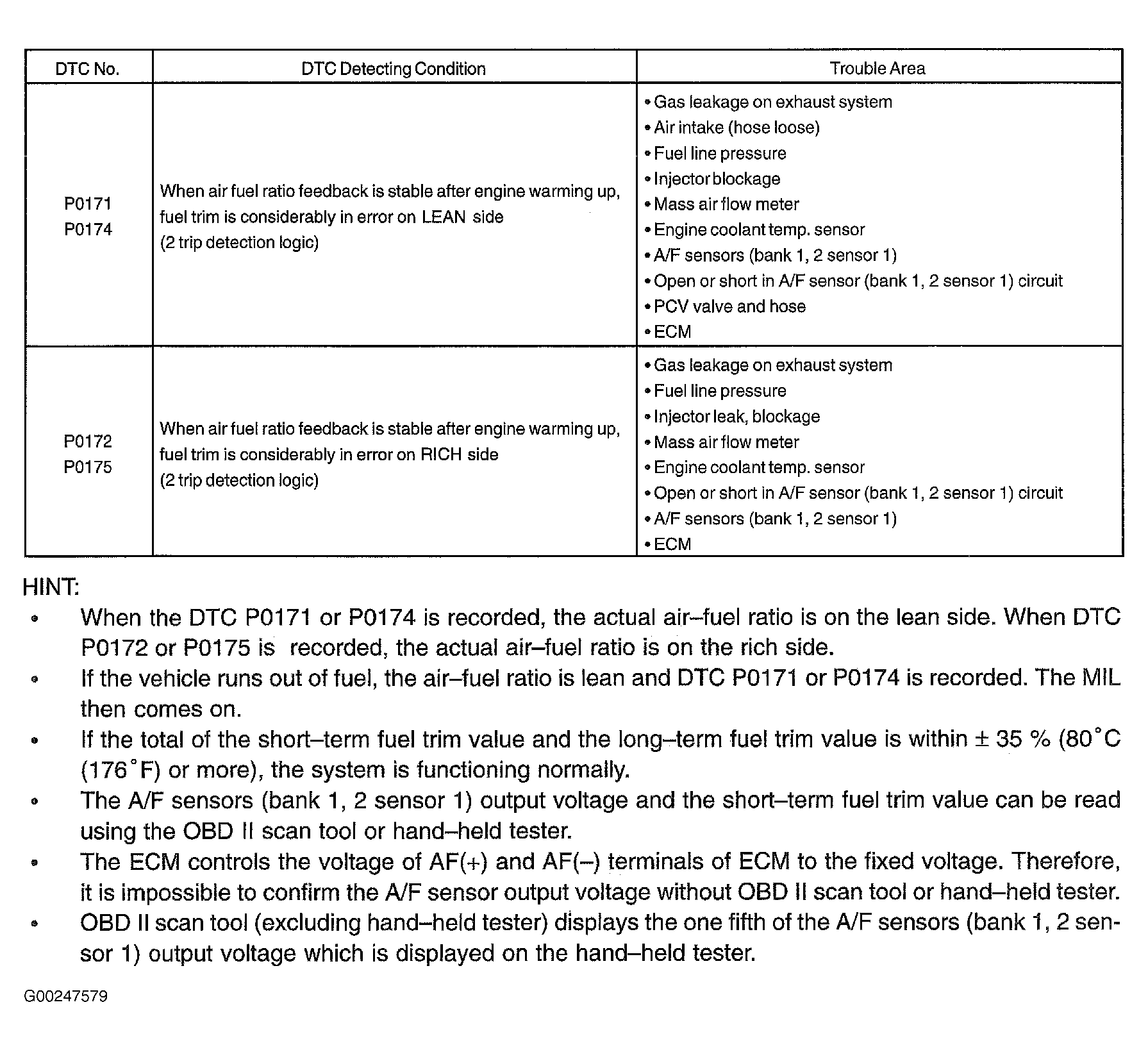 DTC P0171: System Too Lean (Bank 1), DTC P0172: System Too Rich (Bank 1), DTC P0174: System Too Lean (Bank 2) Or DTC P0175: System Too Rich (Bank 2)