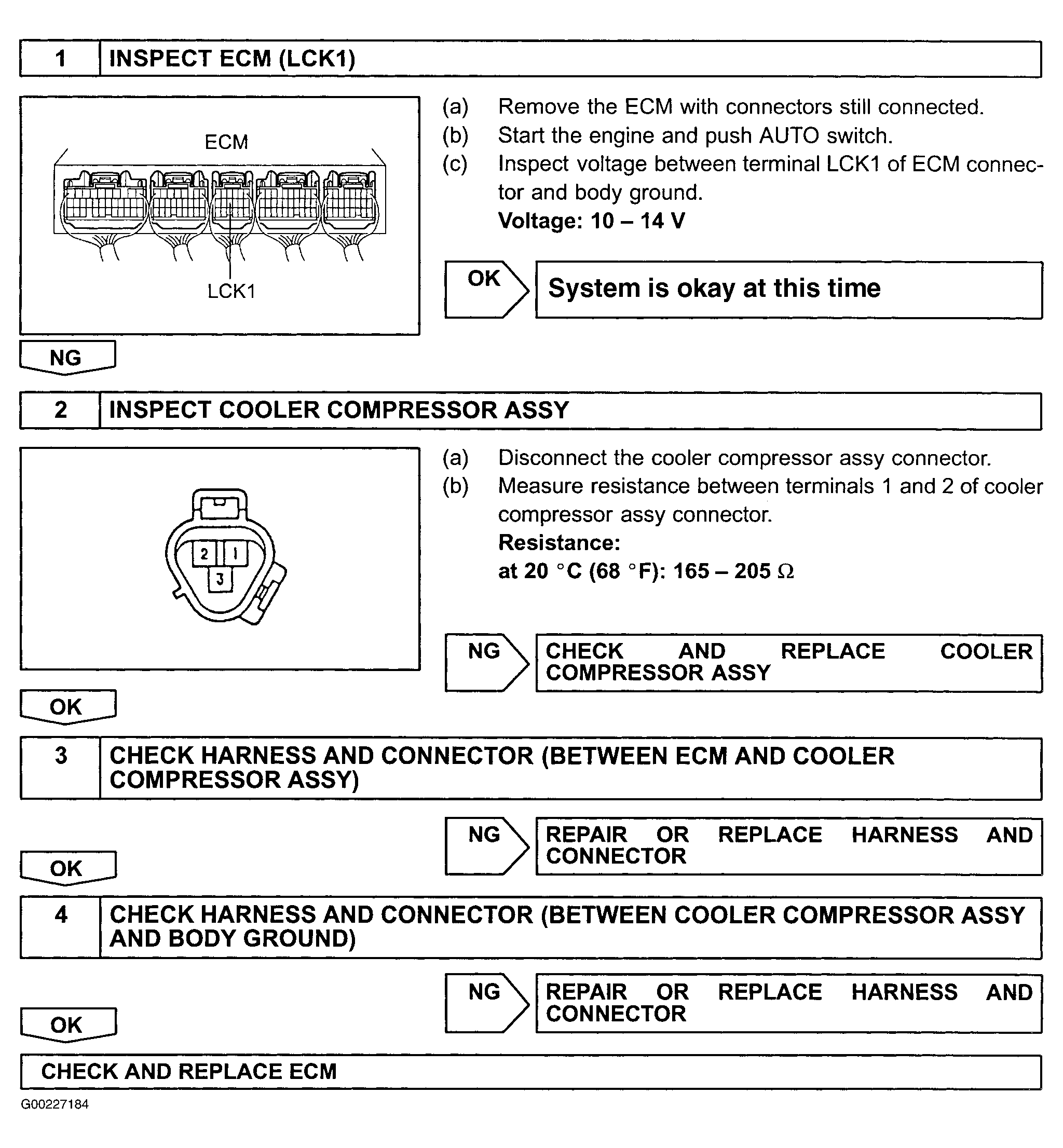 For A/C compressor lock sensor circuit inspection, see Fig 1 and Fig 2 . Before replacing ECM, check ECM connectors and ground circuits. See ENGINE CONTROL MODULE POWER & GROUND CIRCUITS .