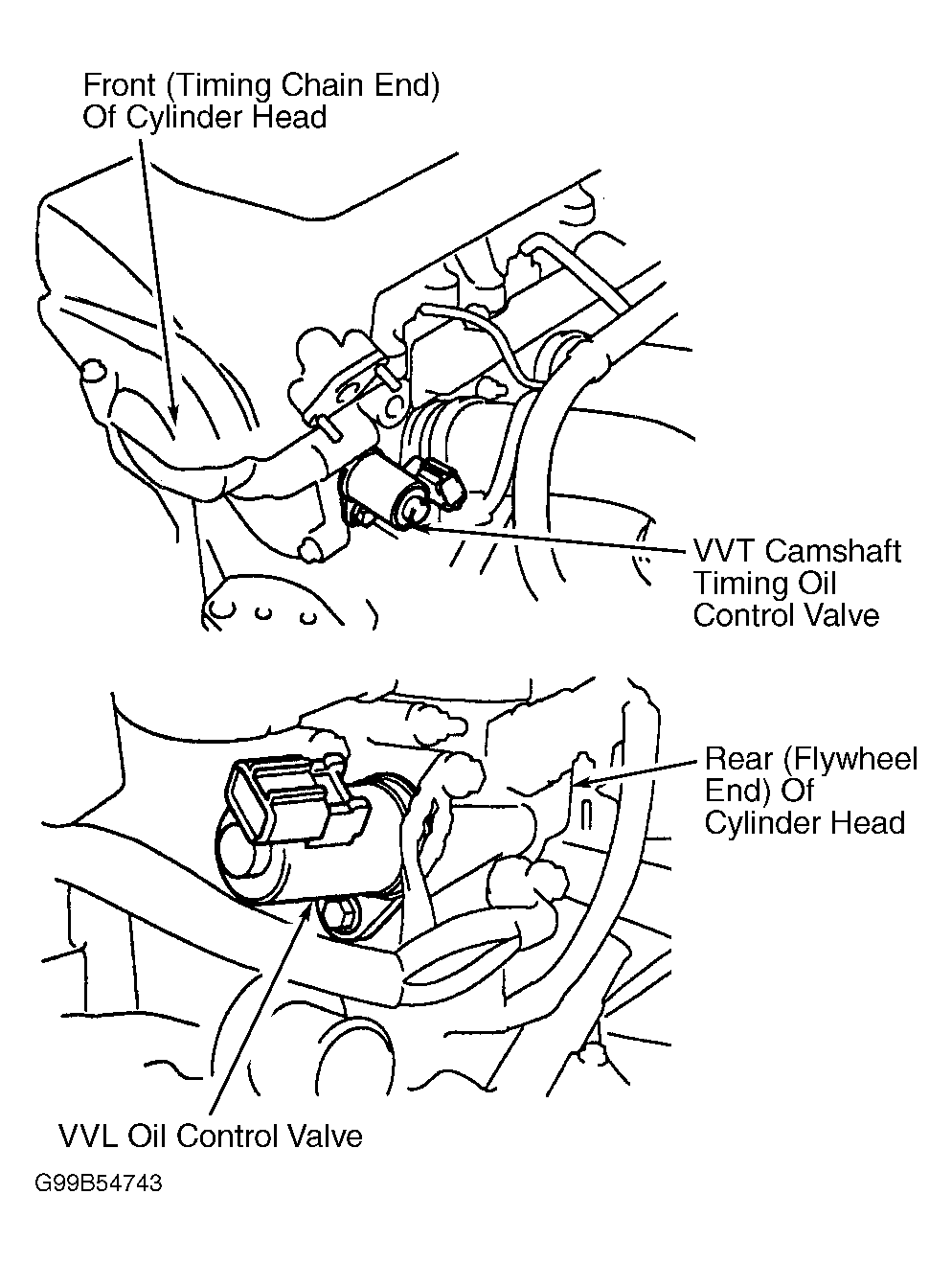 Fig 1: Locating Variable Valve Lift Oil Control Valve & Variable Valve Timing Camshaft Timing Oil Control Valve (Celica)