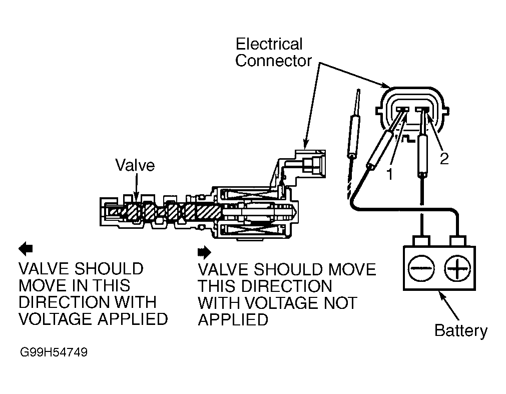 4. Note movement of valve inside VVL oil control valve while applying and disconnecting battery voltage and ground to terminals No. 1 and 2 on VVL oil control valve. See Fig 2. Valve should move outward toward end of assembly opposite electrical connector with voltage applied and should move inward toward electrical connector end of assembly with voltage not applied. See Fig 2. Replace VVL oil control valve if operation is not as specified.