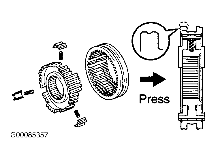 - Apply multipurpose grease to needle bearings. Install bearing in 3rd gear. Place synchronizer ring on 3rd gear, and align ring slots with shifting keys. Using a press, install 3rd gear and No. 2 hub sleeve. See Fig 3.