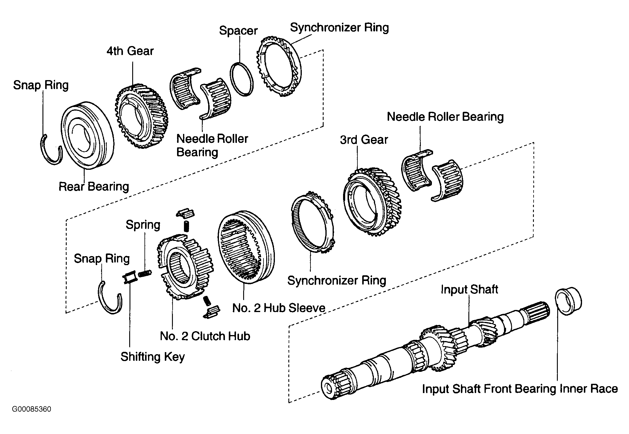 - Check 4th gear thrust clearance. Standard clearance is .004-.022" (.10-.55 mm). Using a press, install input shaft front bearing inner race.
