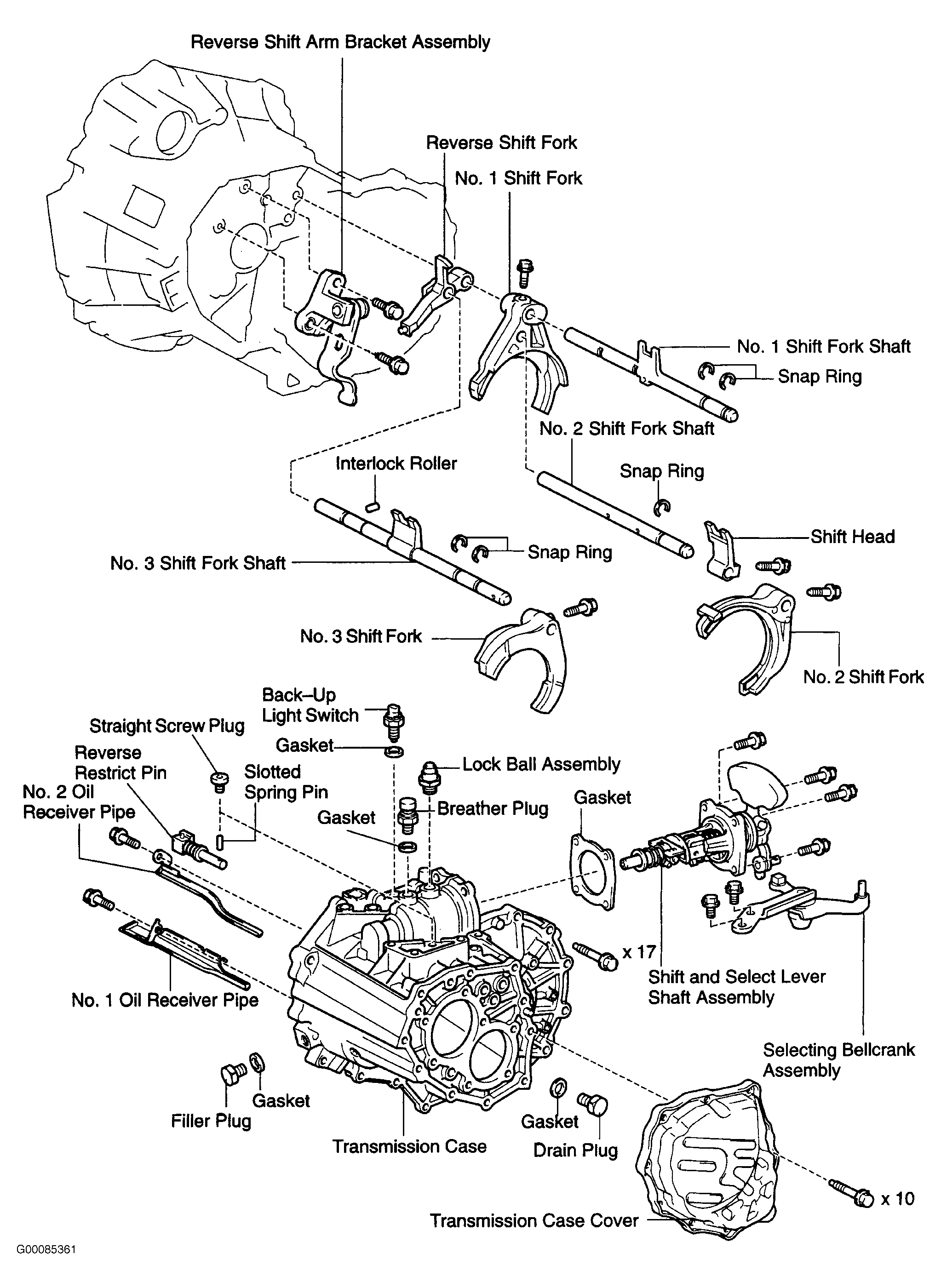 - Install reverse idler gear and shaft. Ensure reference marks on idler gear and clutch housing are aligned. See Fig 1. Place reverse shift fork pivot into reverse shift arm and install reverse shift arm bracket to clutch housing. Install No. 1 and No. 2 oil pipes. See Figure.