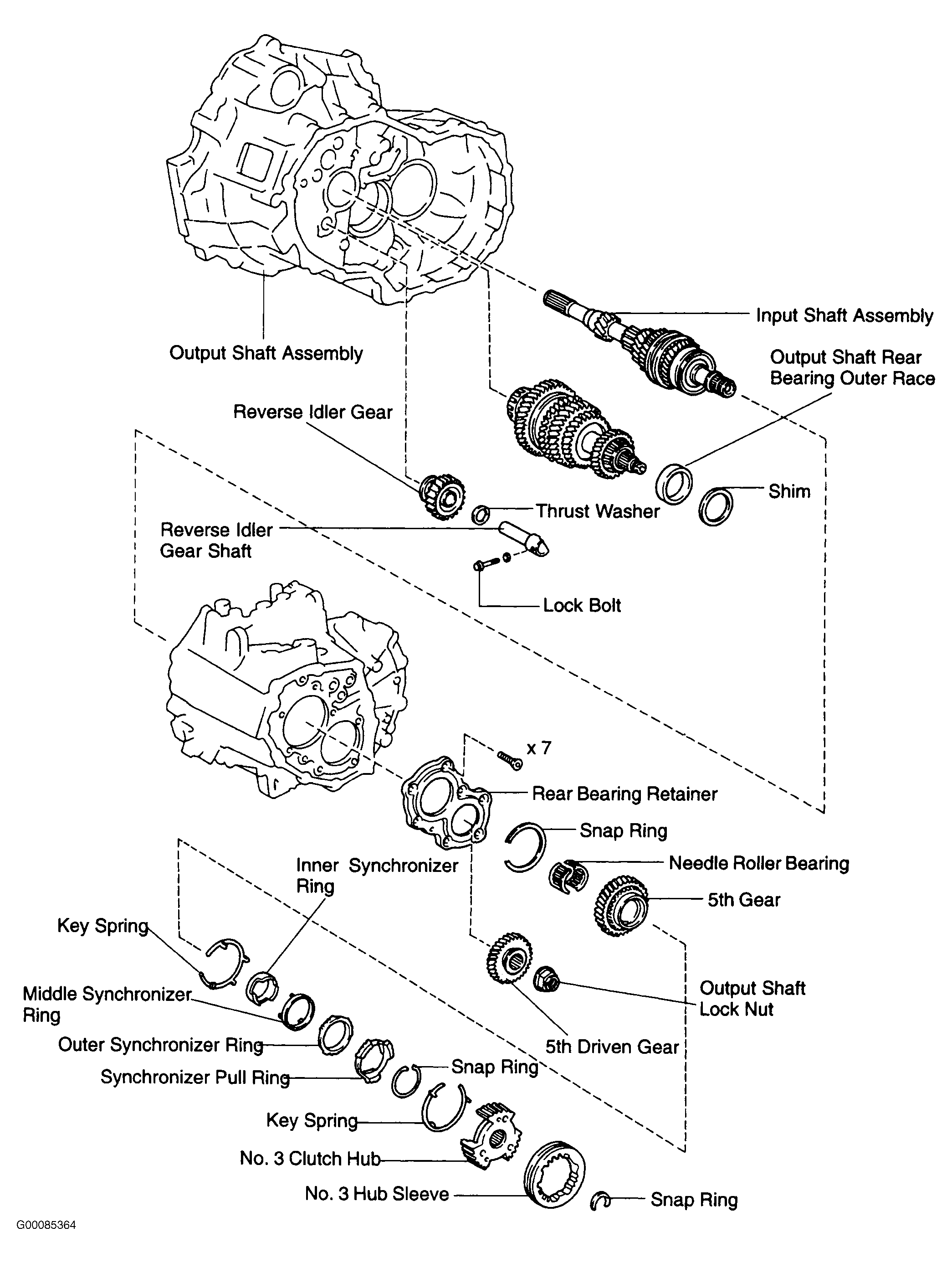- Install output shaft rear bearing outer race. Install appropriate adjusting shim. Install snap ring to input shaft rear bearing. Install rear bearing retainer. Install needle bearing and 5th gear. Install synchronizer ring and key spring to No. 3 clutch hub. Install No. 3 clutch hub with synchronizer assembly.
