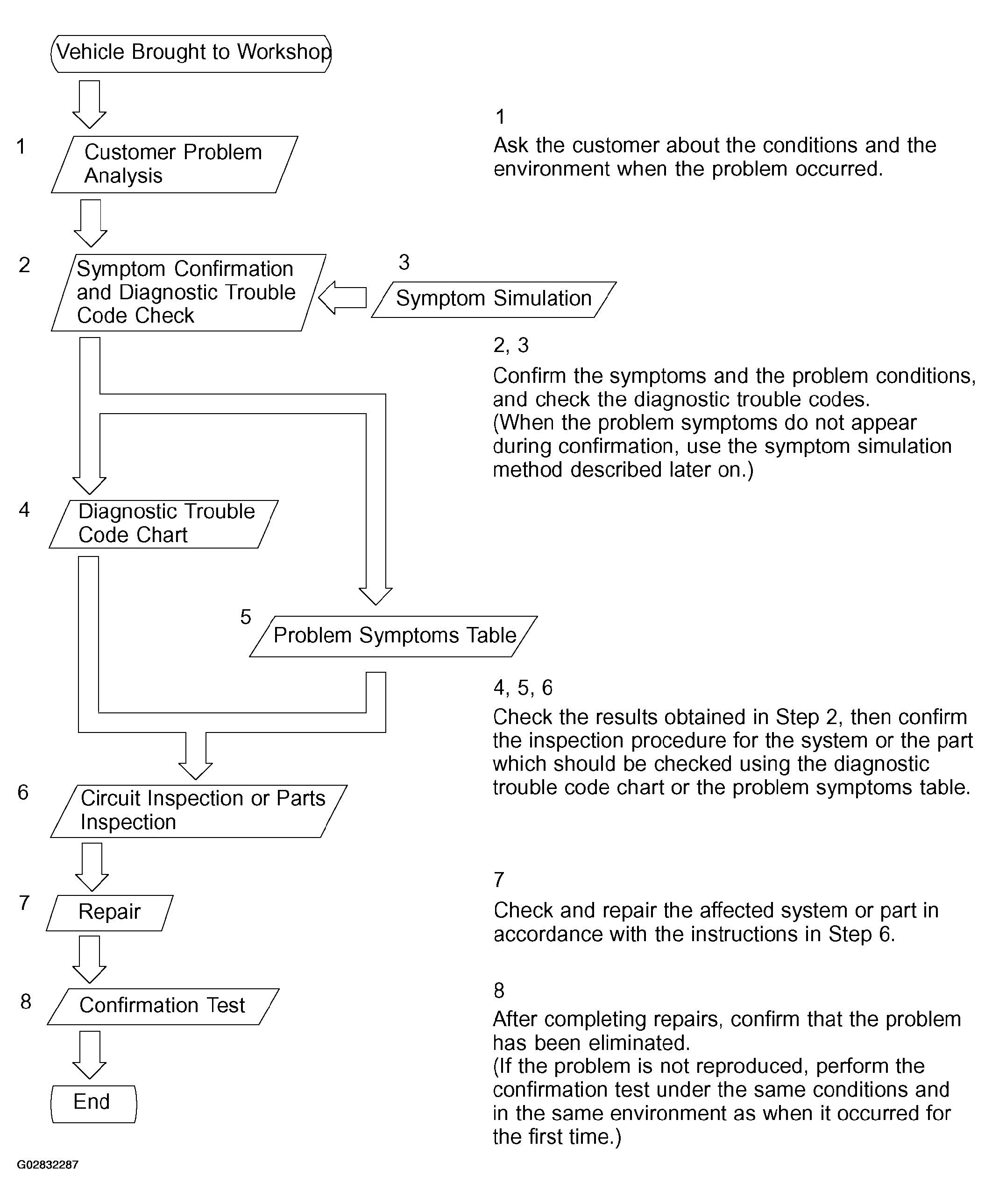 Taking into account the points in Fig 5, a flow chart showing how to proceed with troubleshooting using the diagnostic trouble code check is shown below. This flow chart shows how to utilize the diagnostic trouble code check effectively, then by carefully checking the results, indicates how to proceed either to diagnostic trouble code troubleshooting or to troubleshooting of problem symptoms table.