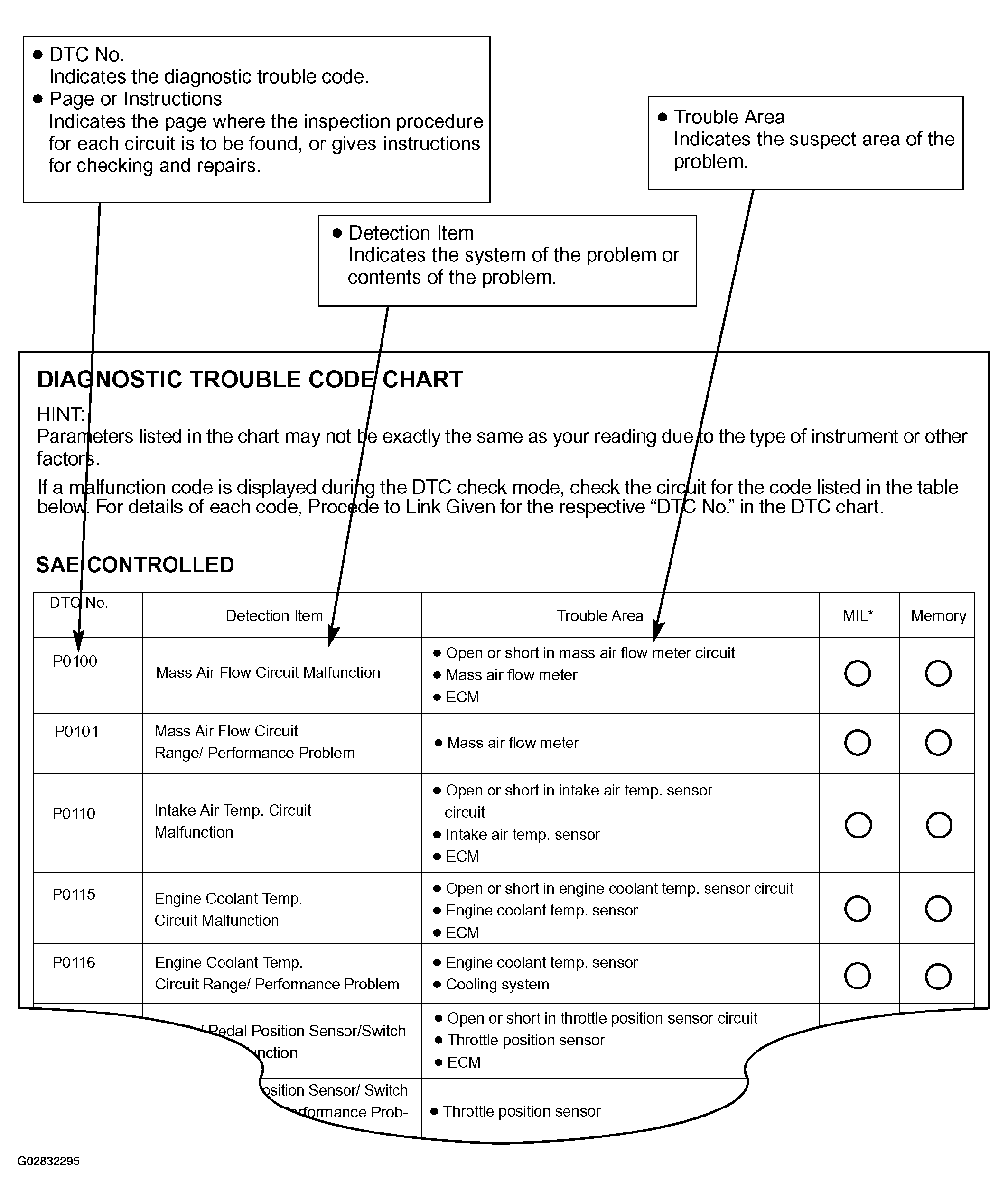 The inspection procedure is shown in Fig 9. This table permits efficient and accurate troubleshooting using the diagnostic trouble codes displayed in the diagnostic trouble code check. Proceed with troubleshooting in accordance with the inspection procedure given in the diagnostic chart corresponding to the diagnostic trouble codes displayed. The engine diagnostic trouble code chart is shown below as an example.