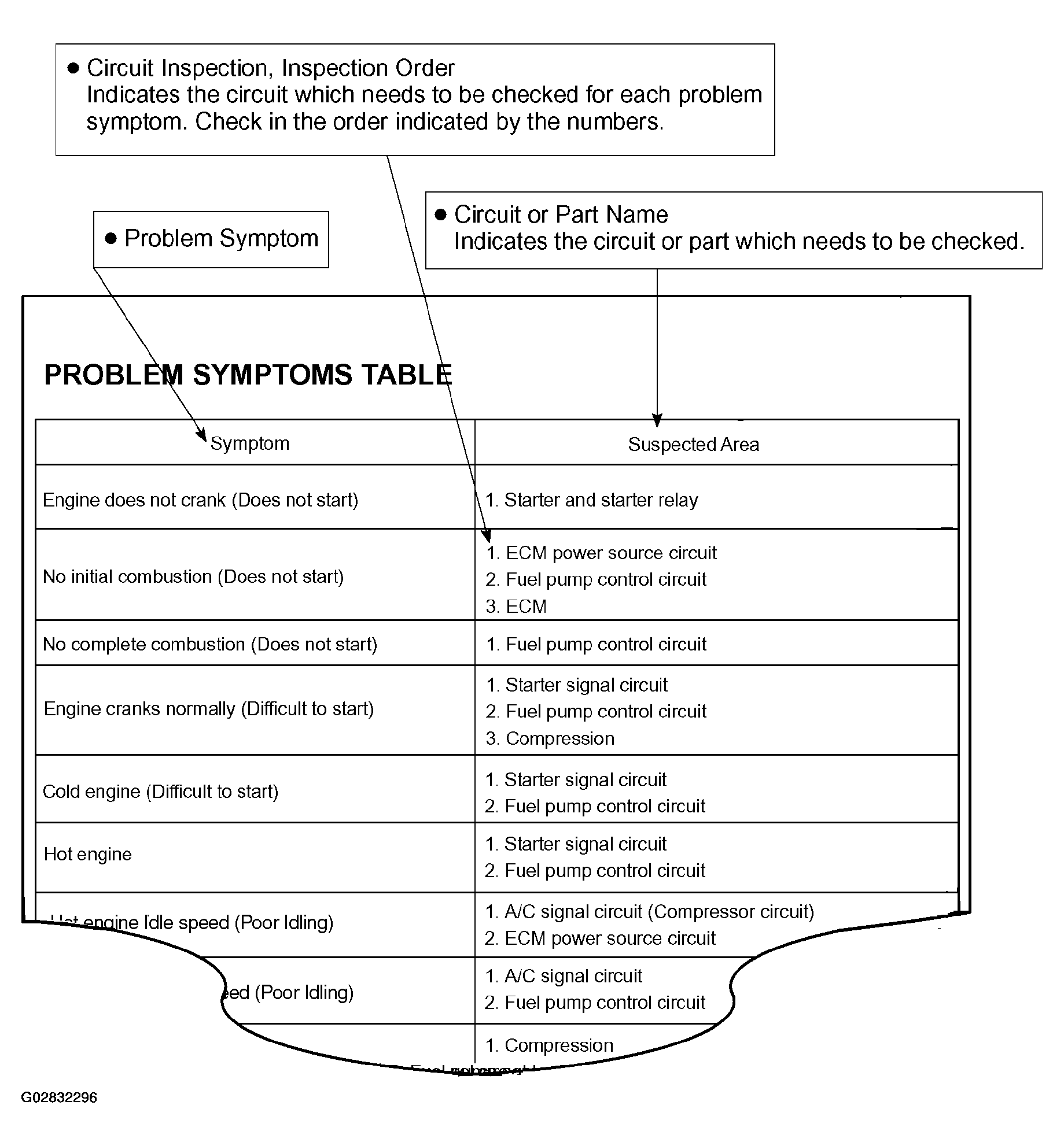 The suspected circuits or parts for each problem symptom are shown in Fig 10. Use Fig 10 to troubleshoot the problem when a "Normal" code is displayed in the diagnostic trouble code check but the problem is still occurring. Numbers in Fig 10 indicate the inspection order in which the circuits or parts should be checked.