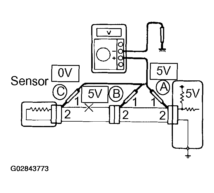 5V: Between Terminal 1 of connector "B" and Body Ground