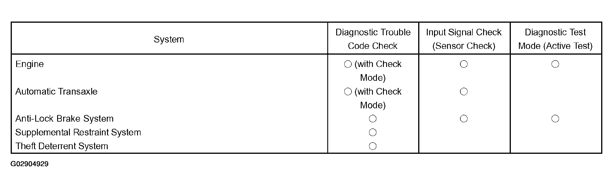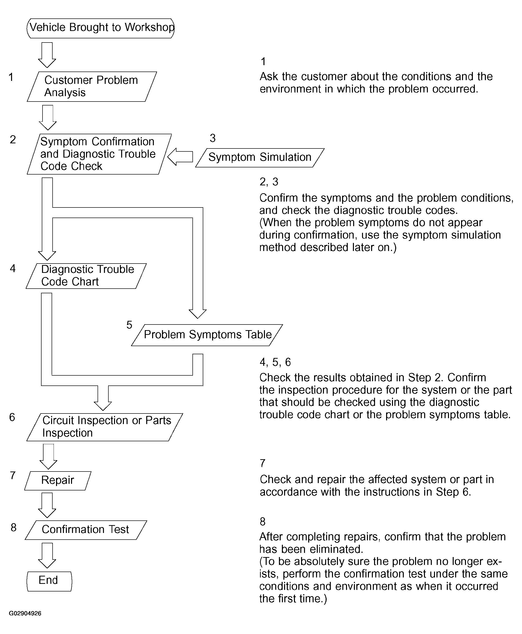 First, narrow down the possible problem circuits according to the symptoms. Then, connect the tester and carry out the symptom simulation test, judging whether the circuit being tested is defective or normal, and also confirming the problem symptoms at the same time. Refer to the problem symptoms table, for each system, to narrow down the possible causes of the symptom.