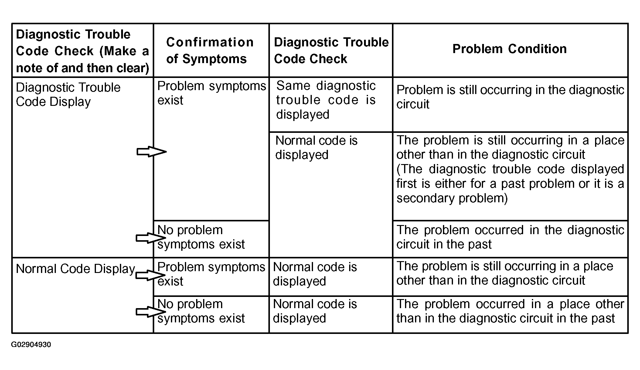 In the DTC Check, it is very important to determine whether the problem indicated by the DTC is: 1) still occurring, or 2) occurred in the past but has since returned to normal. In addition, the DTC should be compared to the problem symptom to see if they are related. For this reason, DTCs should be checked before and after confirmation of symptoms (i.e., whether or not problem symptoms exist) to determine current conditions, as shown in Fig 5 .