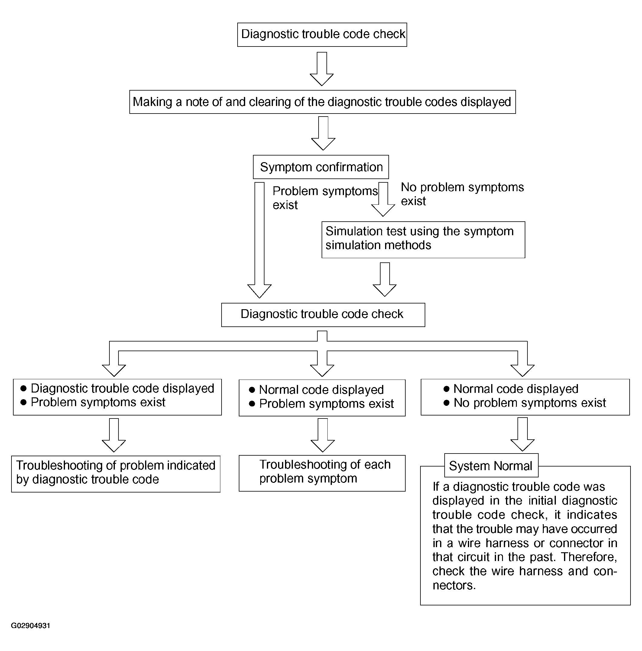 Carry out the basic troubleshooting procedure shown in Fig 1 . Details in the Diagnostics area show the most effective methods for each circuit. Confirm troubleshooting procedures first for the relevant circuit before beginning troubleshooting of that circuit.