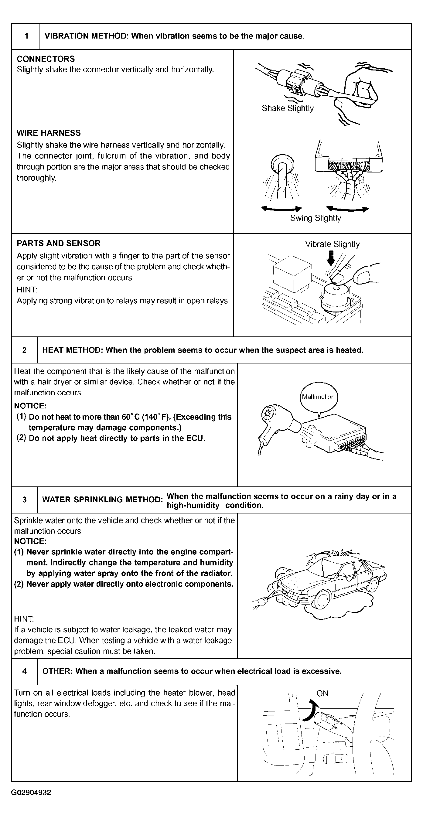 Vibration, heat or water penetration (moisture) is difficult to reproduce. The symptom simulation tests are effected substitutes for the conditions and can be applied on a stationary vehicle. Fig 7