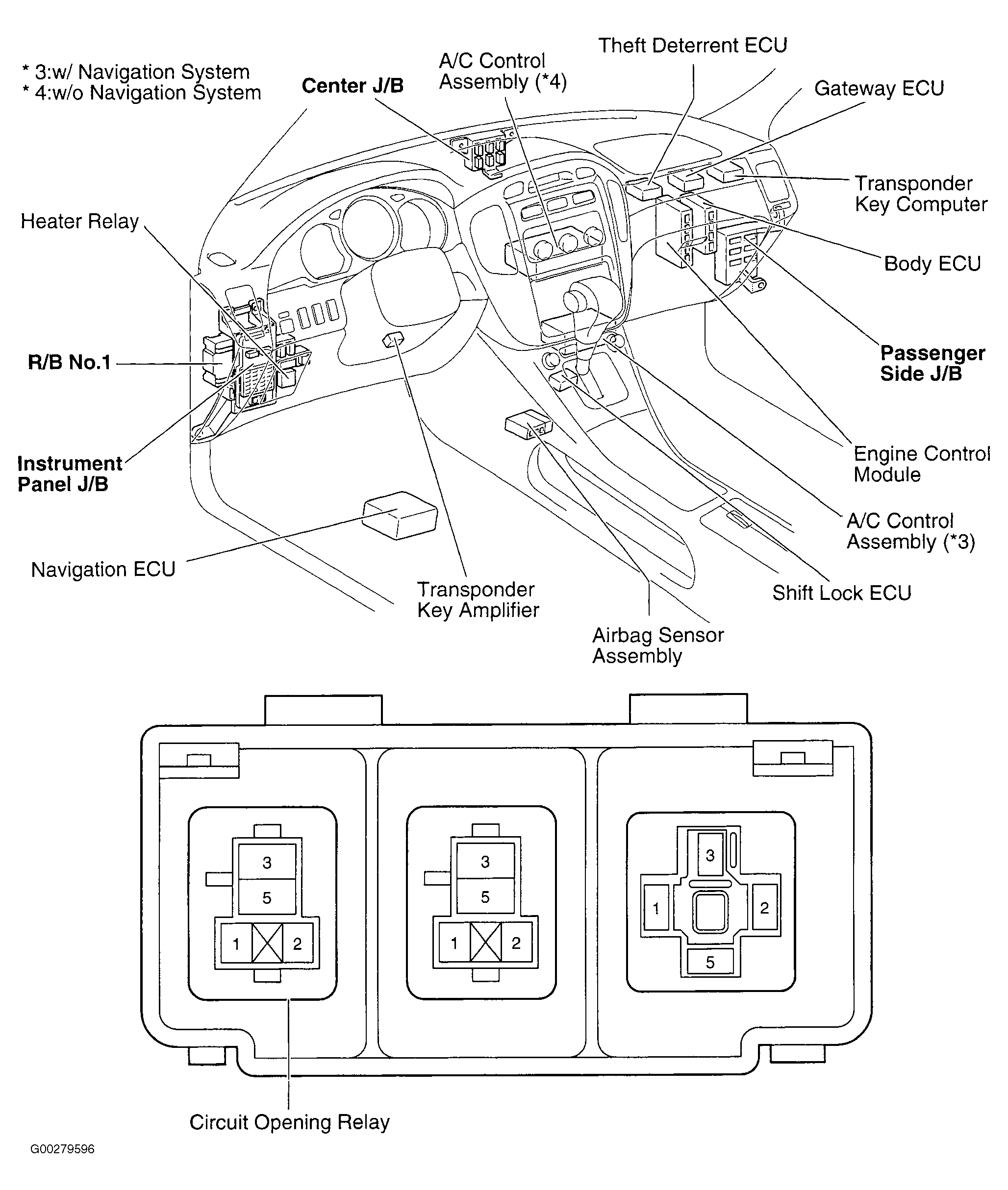 Check fuel pressure with engine off and using Toyota hand-held tester connected to data link connector No. 3 with ignition on to activate fuel pump or remove the circuit opening relay from the relay box sub-assembly (R/B No. 1) and connect a jumper wire to socket terminals No. 3 and No. 5 of the relay box sub-assembly. See Fig 1.