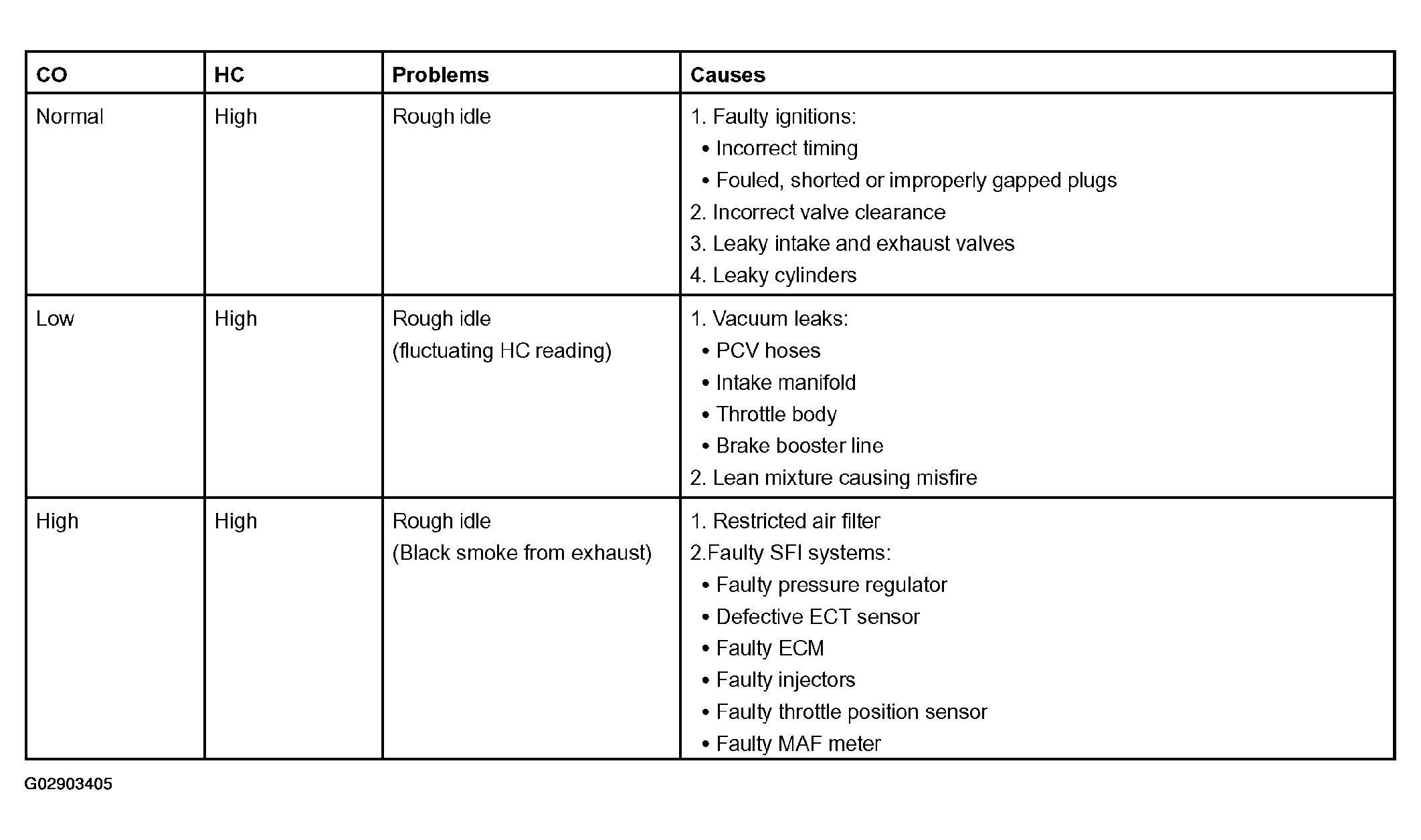 If the CO/HC concentration does not comply with the regulations, perform troubleshooting in the order given in illustration. See Fig 2 for possible causes, and then inspect and correct the applicable causes if necessary.
