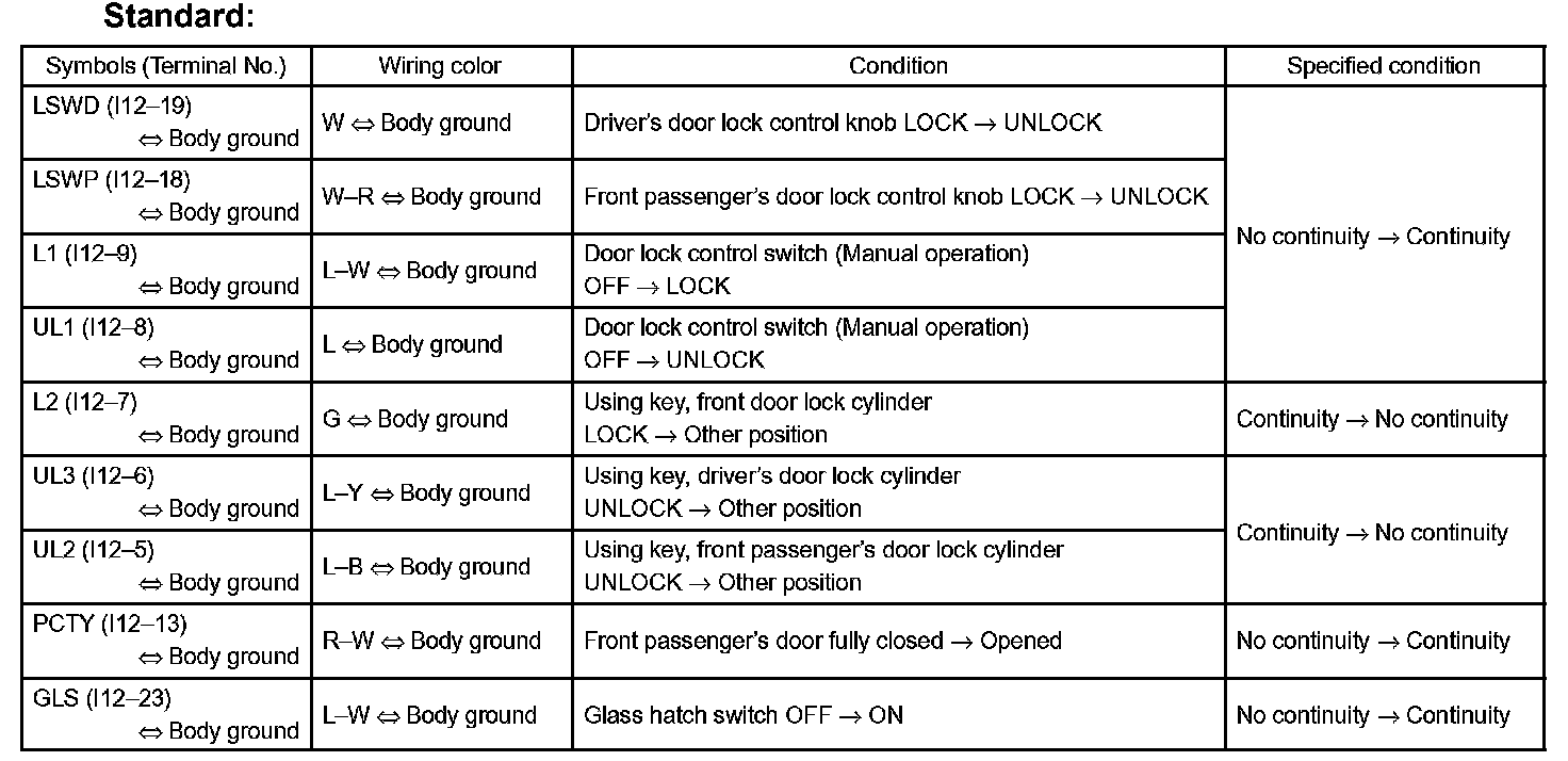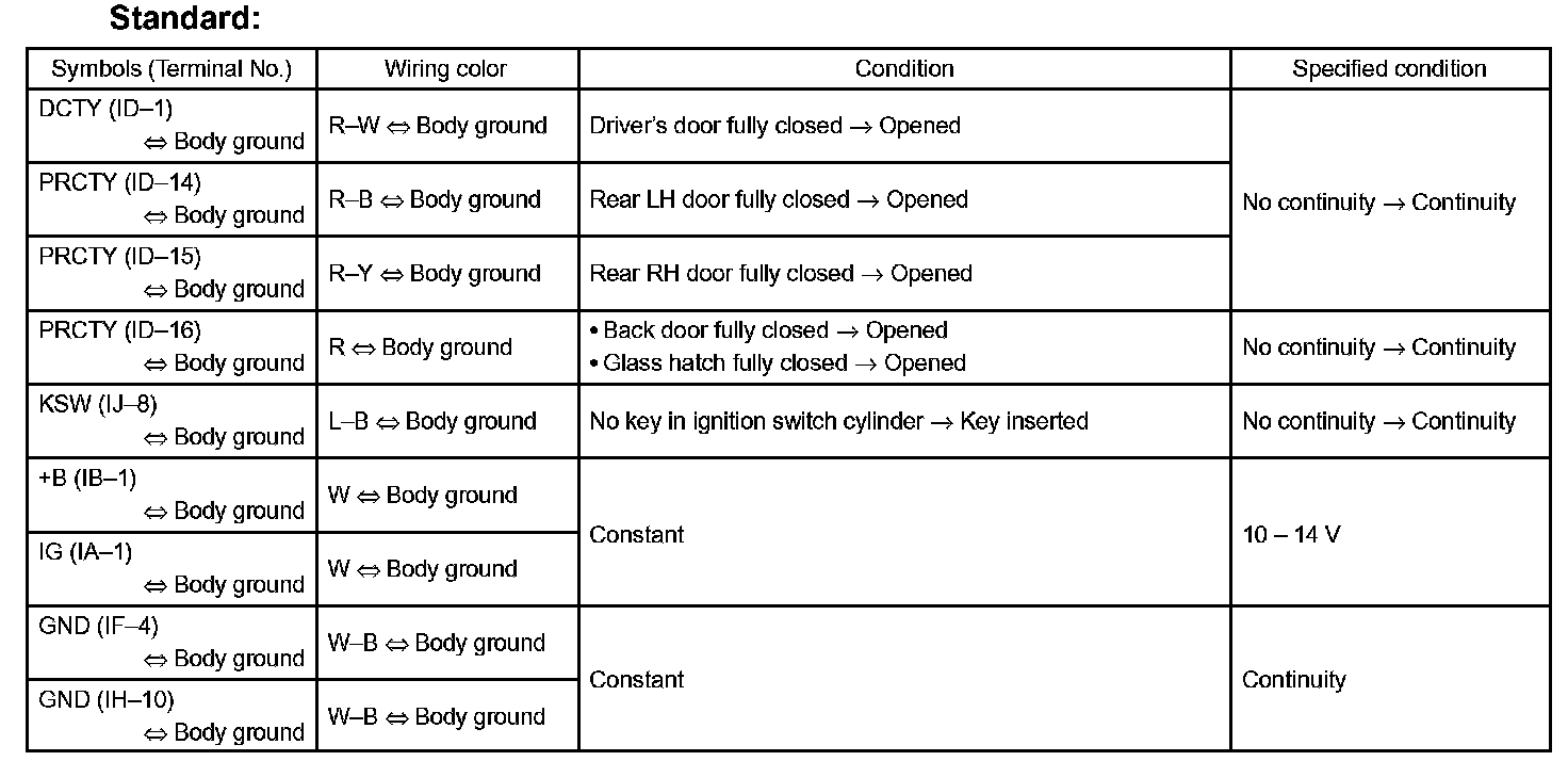 b. Check the continuity between each terminal of the disconnected connector and the body ground, as shown in the illustration and table.