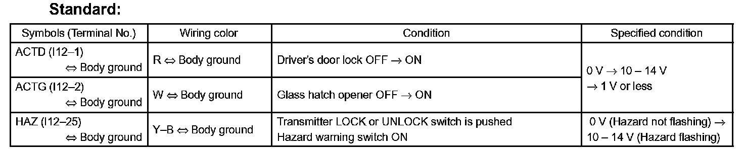 c. Reconnect the connectors and check the voltage between each terminal and the body ground, as shown in the illustration and table.