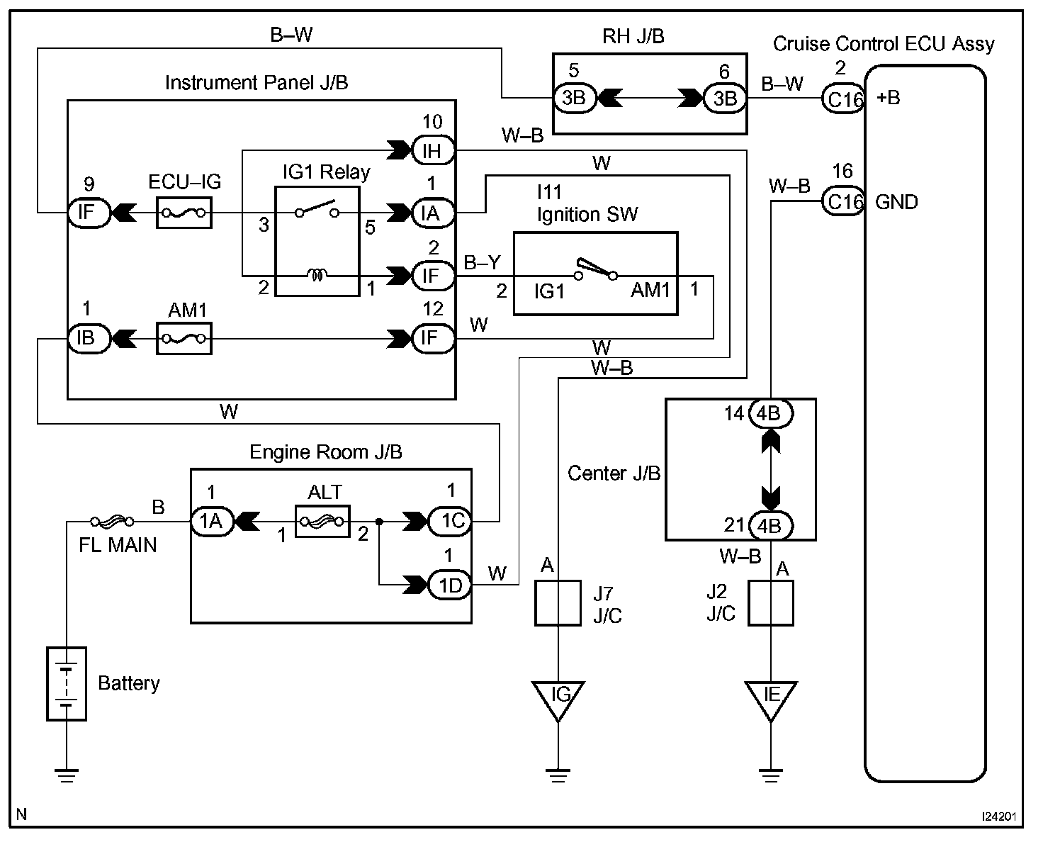 The cruise control ECU assy power source supplies power to the actuator and sensors, etc., when terminal GND and the case of the cruise control ECU assy are grounded.