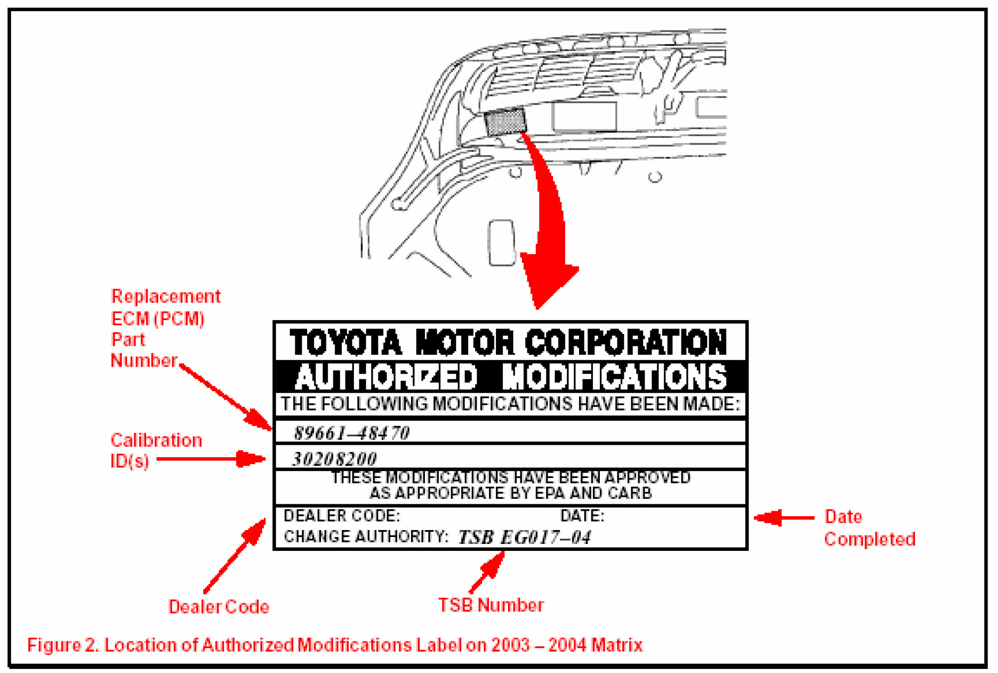 1. Check for the Authorized Modification Label affixed to the vehicle in the location shown in Figure 2. If there is no label present, proceed to step 2.