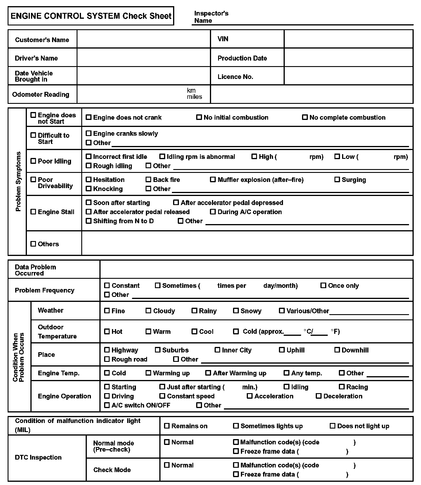 Engine Control System Check Sheet:
