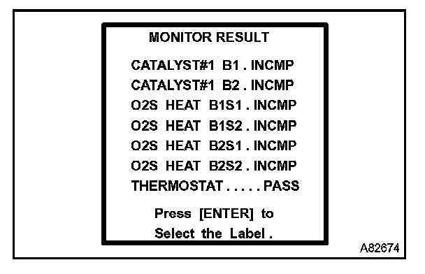 b. Enter "MONITOR RESULT" from "DIAGNOSIS/ENHANCED OBD II/MONITOR INFO/MONITOR RESULT" on the hand-held tester. You will see "Test ID" and "INCMP", "Pass" or "Fail" on the MONITOR RESULT screen.