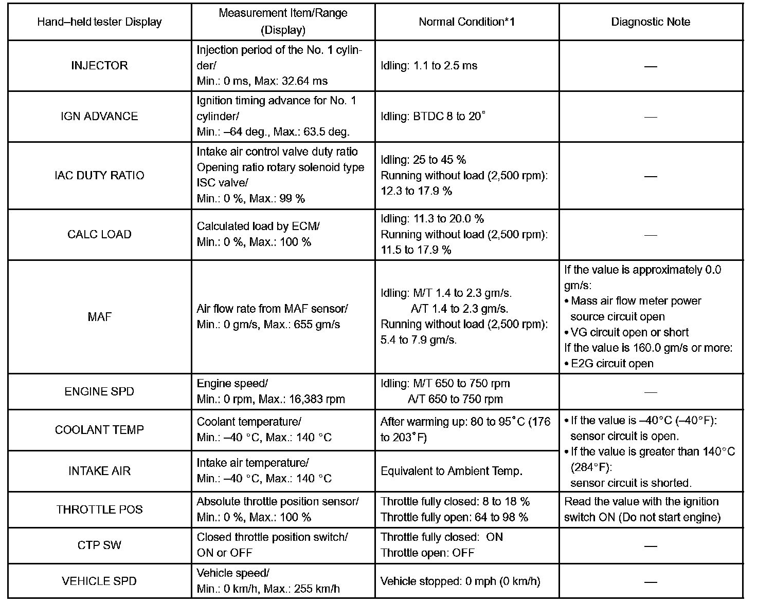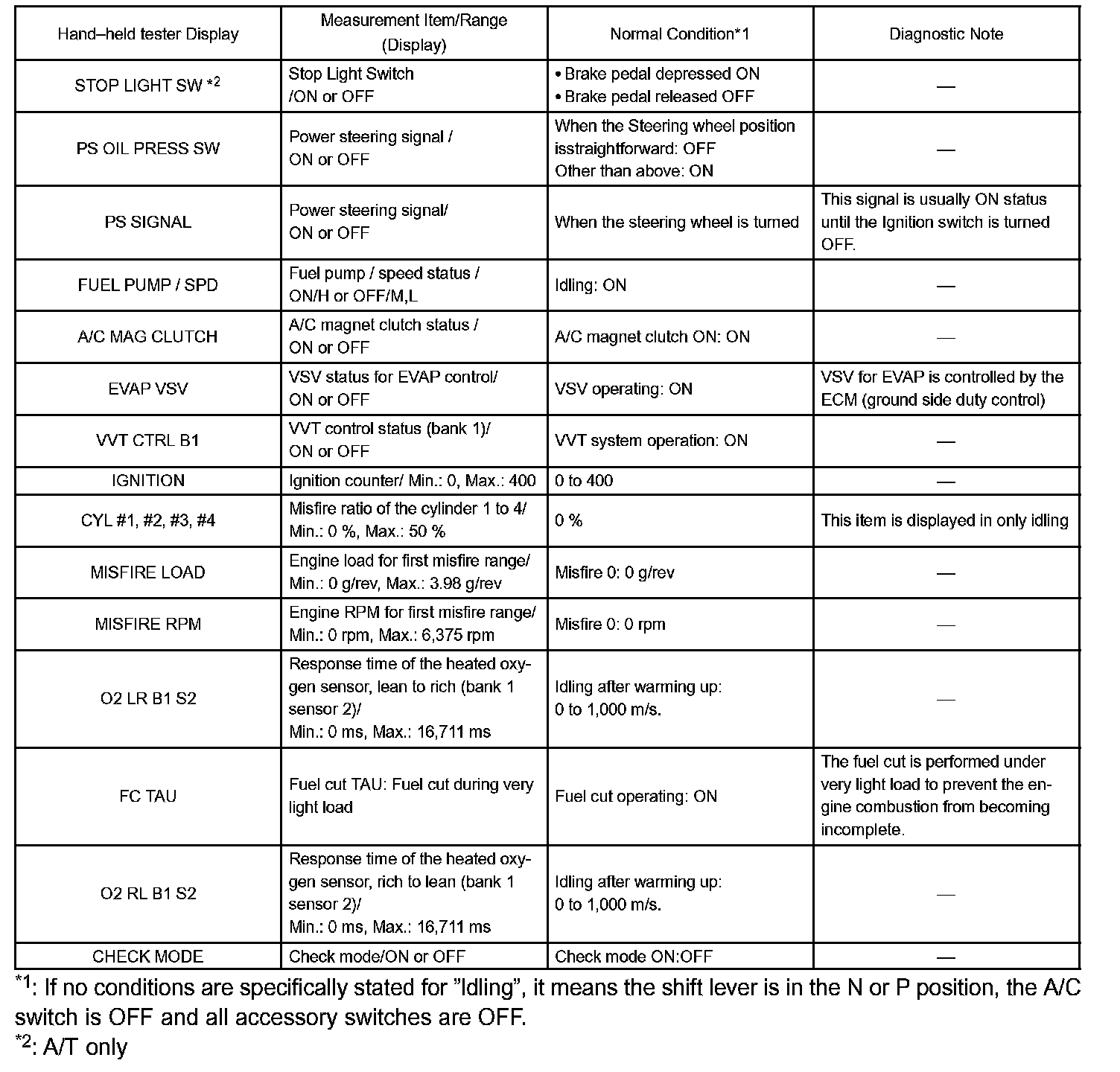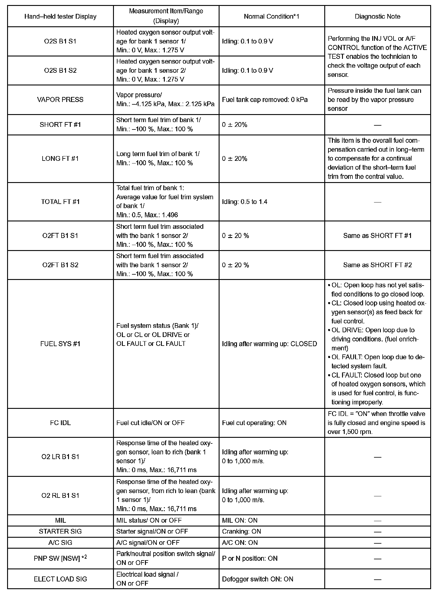 DATA LISTHINT: Using the DATA LIST displayed by the hand-held tester or the OBD II scan tool, you can read the value of the switches, sensors, actuators and so on without parts removal. Reading the DATA LIST as a first step of troubleshooting is one method to shorten diagnostic time.