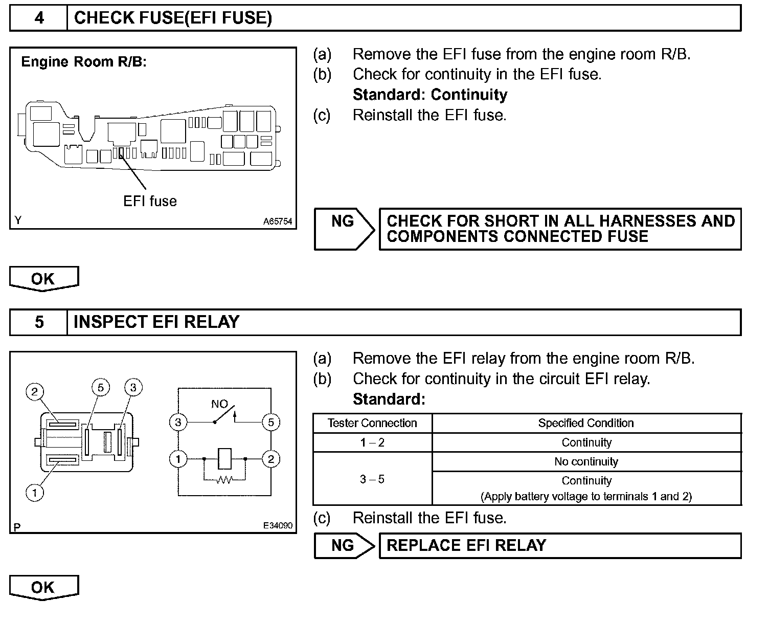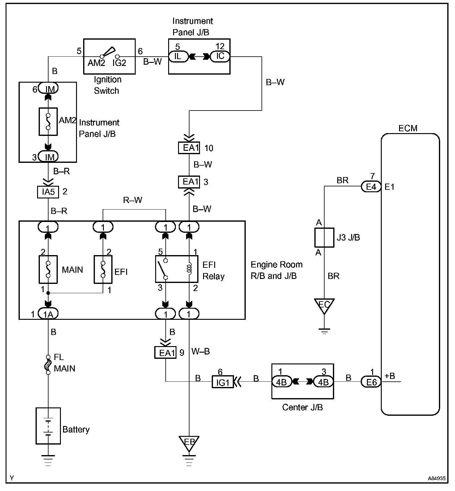 When the ignition switch is turned ON, battery positive voltage is applied to the coil which closes the contacts of the EFI relay (Marked: EFI) and supplies power to terminal +B of the ECM.