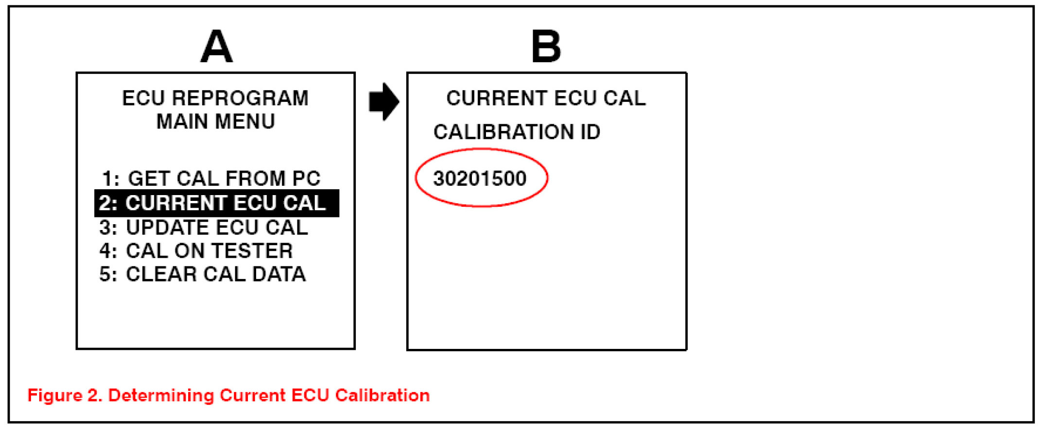 2. Connect the Diagnostic Tester to the vehicle and select CURRENT ECU CAL from the ECU REPROGRAM MAIN MENU. Determine the vehicle's current ECU calibrations (see Figure 2).