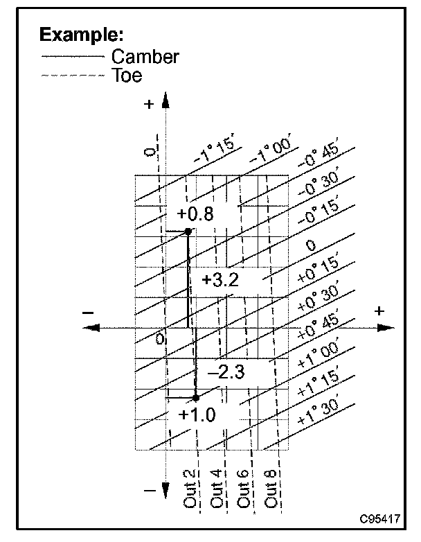 (3) As shown in the example chart, read the distance from the marked point to center of the chart, and adjust the upper and/or lower arm adjusting cams accordingly.