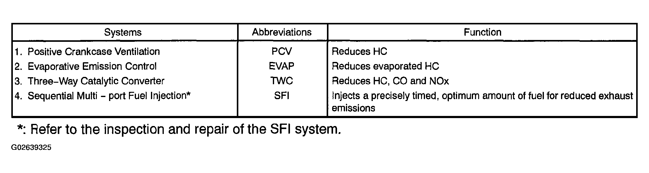 The emission control systems are installed to reduce the amount of CO, HC and NOx exhausted from the engine (3 and 4). They prevent blow-by gas containing HC from being released into the air (1) and evaporated fuel containing HC from being released from the fuel tank (2).